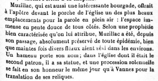 Muzillac, qui est aussi une intéressante bourgade, offrait à l’apôtre devant le porche de l’église un des plus beaux emplacements pour la parole en plein air : l’espace immense en pente douce de tous côtés. Selon une prophétie bien caractérisée qu’on lui attribue, Muzillac a été, depuis son passage, absolument préservé de toute épidémie, bien que maintes fois divers fléaux aient sévi dans les environs. Un hameau porte son nom*; dans l’église dont il était le second patron, il a sa statue, et une procession solennelle se fait en son honneur le même jour qu’à Vannes pour la translation de ses reliques. »
