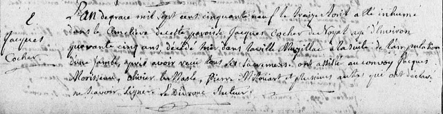 C’est le cas lors du décès de Jacques Cocher. Jean-Jacques-Antoine Le Didrouc, recteur de la paroisse de 1742 à 1763, nous apprend que ce paroissien de Noyal, âgé de 45 ans, est décédé « à la suite de l’amputation d’une jambe« .
