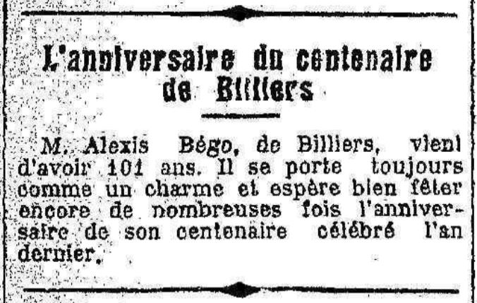 En 1925, Alexis Bégo, doyen de la commune de Billiers, fait la une de la presse locale : il fête ses 100 ans ! Alexis Bégo est né le 28 juin 1825 à Billiers fils de Perrine Bégo, petit-fils de Pierre Bégo, marin, et Julienne Boulluac. A 10 ans il pêche le congre; à 20 ans il part au service de l’Etat sur la corvette « L’Arthémise ». Son service le conduit pendant 5 ans sous toutes les latitudes du globe. Il débarque en Amérique, en Afrique et en Océanie. En 1850 il entre à l’Ecole d’Hydrographie de Lorient et passe avec succès l’examen de capitaine au cabotage. Il voyage encore quelques années puis la guerre de Crimée l’ayant porté à bord du « Cassini », il reste deux ans en rade de Sébastopol. Marié à Billiers en 1859 avec Jeanne Le Neué, puis en 1897 avec Jeanne Marie Louise Le Bodo, il eut onze enfants. Libéré et ayant hâte de revenir au pays, il s’installe à Billiers mais en repart peu de temps après avec le titre de capitaine marin. Il visite alors l’Angleterre, la Hollande, l’Allemagne. Il quitte définitivement la dunette du commandement en 1866. Appelé par le maître de port de Saint-Nazaire, le lieutenant de vaisseau Tiret, il est nommé gardien en chef des signaux du port et a sous ses ordres quarante gardiens. A 76 ans, il quitte Saint-Nazaire et revient à Billiers prendre ses quartiers de repos. Le capitaine Bégo est titulaire de la médaille de Crimée et de la médaille d’or de la marine Le 25 juin 1925 il est nommé Chevalier de la Légion d’Honneur par le Ministre des Travaux Publics Marine Marchande Pêches. Alexis Bégo décède le 24 juillet 1928 à Nantes.